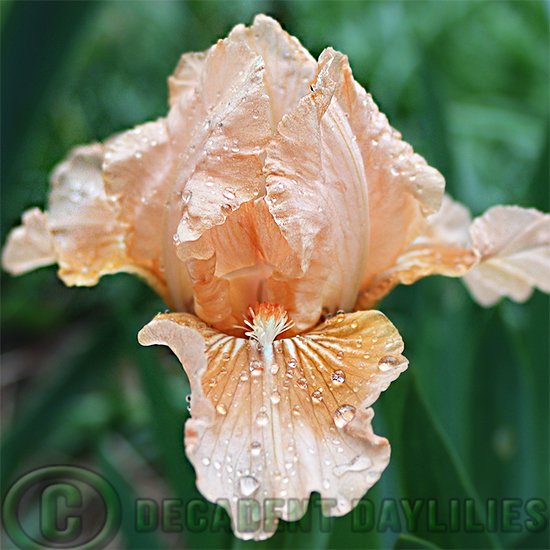 Dwarf Bearded Iris Apricot Kisses – Standards are apricot and falls are rich apricot shaded to pink. Beards are bright tangerine tipped white. Excellent, good branching.