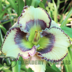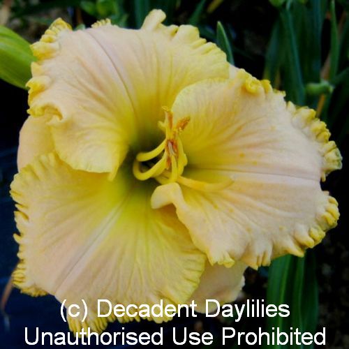Daylily Dream Machine – Superb pale creamy yellow pastel. Heavily ruffled, bubbly, glittering edge. Near perfect scapes, 4 way branching, 28 buds. Opens well with none of the problems sometimes seen with such ruffled edges. Very vigorous grower and a superb parent.