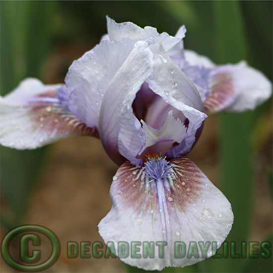 Dwarf Bearded Iris Merry Dance – Icy blue self. Falls have a rosy brown area halfway down. Beards lavender blue, tangerine in throat.