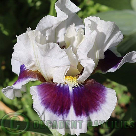Dwarf Bearded Iris Stop And Stare – Standards are white with lemon tints. Style arms are white. Falls unfold with a huge navy spot that fades to burgundy blue, complete with a wide white band and a little white dart below the beard. Beards are yellow-orange with a white tip, and there is a faint smell. Capiche X Riveting.