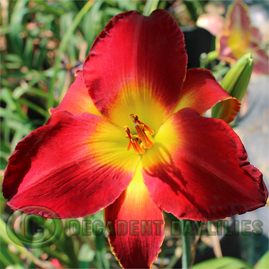 Daylily Hunter’s Torch – Cardinal red edged gold with green throat. (Sultans Ruby × Vintage Bordeaux) Awards: HM 1993, JC 1989