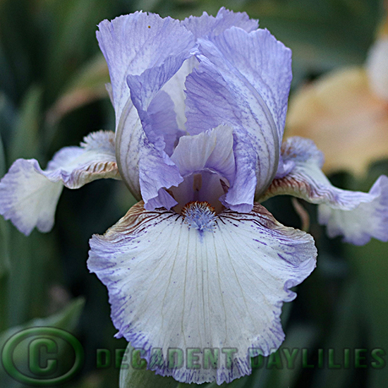 Median Bearded Iris Silique standards lavender blue, small white area. Falls white, 1/4″ solid deeper lavender blue edge, 1/4″ inner band of blue dots, hafts brown. Beards lavender at end, old gold to bronze in throat. Sweet fragrance.