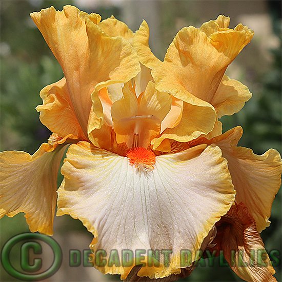 Tall Bearded Iris Champagne Waltz standards apricot yellow. Falls ruffled creamy white, 1/4″ apricot yellow edge. Beards tangerine.